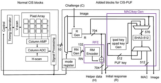 Next, the added block diagram for the CIS-PUF on the right side of Figure 5 is explained. The added block, which includes an RM (Reed–Muller) encoder for error correction and SHA3-512 for the hash function, performs processing to calculate the helper data and MAC value to be sent to the host device. In the PUF mode, the pixel to be used for the response is selected through challenge C, and the R generator (Gen) compares the output values from two adjacent pixels in the same column to generate responses. Then, the PUF response is input into SHA3-512 to generate a PUF key. In the RNG mode, the RN Gen extracts the least significant bit of the output value and performs XOR on two adjacent pixels in the same column to generate a random number. Then, helper data are generated according to the RFE mechanism. In imaging mode, an ipad key and opad key are generated from the PUF key, and the MAC is generated using these keys, the image data, and SHA3-512.