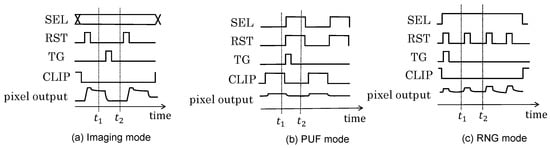 In the PUF mode shown in Figure 7b, the offset caused by the variation in the SF Tr, which was removed in the imaging mode, is extracted as fixed-pattern noise by changing the signal acquisition timing so that CDS is not performed. Here, the reference signal in the PUF mode is the offset of the SF Tr in the CLIP circuit, and CLIP is turned on and read out at . Then, the reset potential of the pixel is measured with the RST and TG turned on () so that the output does not change with the light intensity, and the offset variation in the SF Tr is output as fixed-pattern noise by taking the difference between the two potentials at and . To generate a response from the output value in the PUF mode, the response is determined as 1 or 0 by comparing the values of the adjacent pixels above and below. By comparing the two pixels above and below, the variations in the column FPN caused by using a common CLIP circuit can be removed, and the bias of the response can be reduced [9]. The pixel to be used to generate the response is determined through challenge C.