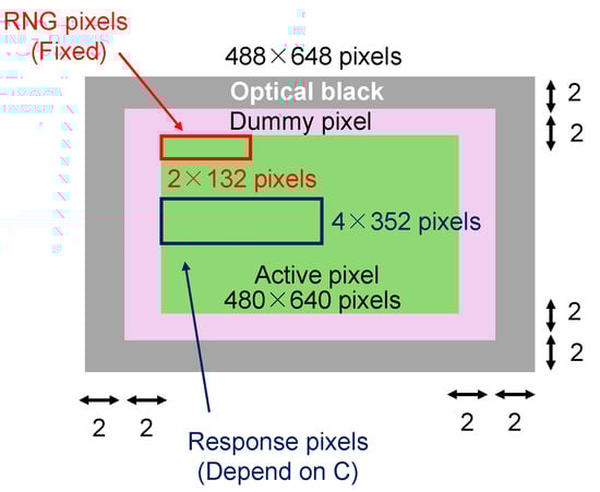 The pixel area that is actually used for image information is called the active pixel area, but there are also dummy pixel areas that are not used to obtain pixel information and optical black areas that determine the black level of the image. The pixel configuration in this implementation is shown in Figure 8. The total pixel size is 488 × 648, and the active pixel size is 480 × 640. The two pixels at the outermost edge are optical black pixels, and the next two pixels are dummy pixels. The response and random numbers are generated from the active pixel area. The PUF key k is shared using an RFE with the Reed–Muller code (32,6) (6 information bits, 32 codeword bits), so the response (R and ) is 704 bits, and the random numbers (RNs) are 132 bits. In the PUF mode, a 704-bit response is generated from the pixels in 4 rows × 352 columns specified by the challenge. In the RNG mode, a 132-bit random number is generated from the pixels in the fixed 2 rows × 132 columns on the top left.