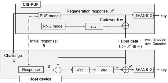 At power-on, the challenge C is input from the host device to generate a regenerated response in the PUF mode, and a PUF key k is generated from . Since contains a response error, and R do not match, and a technique to securely share with the host device is necessary. By sending the XORed value (helper data) of the random number and R from the CIS-PUF to the host device, can be recovered from R using error correction techniques. The helper data are generated by encoding the random numbers generated in the RNG mode and XORing them with . The helper data are sent from the CIS to the host device every time the power is turned on because the data disappear upon powering off. The host device reconstructs from the helper data and R, and it can generate the same PUF key generated in CIS. By inputting the shared data into the hash function, the same PUF key k is shared between the CIS and the host device.