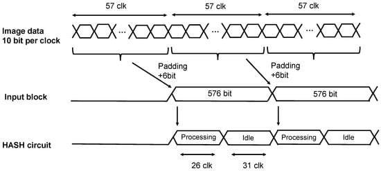 Figure 11 shows the number of clocks required for one input block of the HASH function and the operation timing of the HASH circuit. Image data are read out in one clock for 10 bits per pixel. Since one input block of SHA3-512 is 576 bits, 57 pixels (570 bits) are padded with 6 bits to input one block into the HASH function. In the absorbing phase, it takes 26 clocks to process the Keccak-f function for one block of data. Therefore, there is a 26 (=) clock idle state until the next data are input. By inputting each 570-bit block of pixel data into the HASH function in sequence, it is possible to reduce the additional memory required for MAC calculations from 3 Mbits to 576 bits.