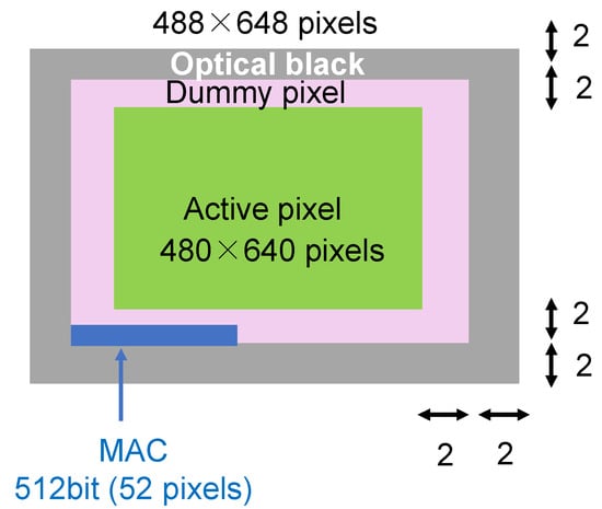 The output data saved on the host device in the imaging mode included not only valid pixels but also dummy pixels and optical black pixels. The data format sent from the CIS board to the host device in the imaging mode is illustrated in Figure 16. Since the dummy pixels did not affect the image data even if the output value was not sent, the MAC value was sent from the CIS board by replacing the 512 bits (52 pixels) of the bottom row of the dummy pixels (486th row overall) with the MAC.