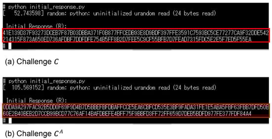 Our countermeasure system was verified using the experimental setup shown in Figure 12. First, the response R generated by inputting challenge C as the initial response was saved, and it corresponded to the device initialization shown in Figure 4. Challenge C used the PUF mode output values from lines 20 to 24. Figure 17a shows the result of displaying this initial response. Figure 17b shows the case where the input challenge was changed to , which was different from C. Challenge used the PUF mode output values from lines 40 to 44. It can be seen that different responses were generated depending on the challenge.