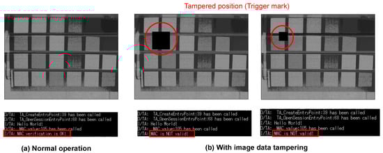 The tampering shown in Figure 19 simulated tampering that would trigger the backdoor shown in Figure 2. It was assumed that this captured image was input into a backdoor model that misclassified the image with a trigger mark in the top left. In this case, it was assumed that the captured image would be misclassified into the target class. However, the MAC verification was able to determine that the input image was tampered with, making it possible to detect the misclassification caused by image tampering through the fault injection attack.