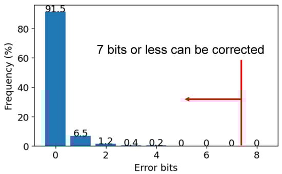 Since the error rate of the PUF response of the CIS-PUF, which was evaluated while taking fluctuations in voltage and temperature into account, is 0.0162 [9], our implementation used RM(32,6) as the error correcting code. RM(32,6) is a Reed–Muller code with 6 information bits, 32 codeword bits, and 7 error-correctable bits. To create a key with 128 or more bits of information from an RFE using RM(32,6), 22 blocks are required (). The helper data and required response are 704 bits (=32 × 22), and all bits of the response are input into SHA3-512 to generate the PUF key. The probability of an error correction failure in any of the 22 blocks, i.e., the key-sharing failure rate, was . This probability was smaller than the value of defined in the previous literature [20] as the key generation failure index for FPGA implementations using a PUF.