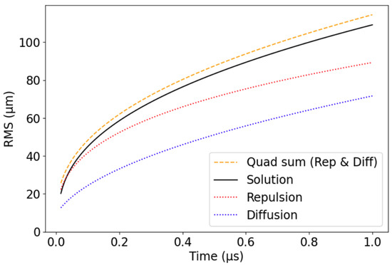 One can calculate the quadratic sum of the RMS for diffusion-only and repulsion-only to obtain a rough estimate of the RMS for the combined effects of diffusion and repulsion, as shown in Figure 3. Note that by decoupling both processes, we can provide an approximate efficient solution that no longer needs to solve PDEs, as we could directly use the analytical solutions.