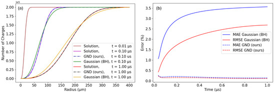 (a) Charge distribution (non-normalized) accounting for the total amount of elementary charges plotted at different times. We see the ground-truth distributions and those generated with the Benoit–Hamel model and with our proposed generalized normal distribution (GND) model. (b) Error metrics of the BH and our GND models.