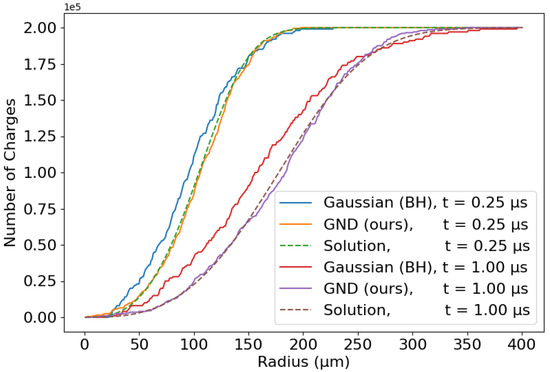 Of course, the same approach followed for the propagation of charge in the x-direction can also be implemented for the y and z axes due to the spherical symmetry. The complete BH method is outlined in Algorithm 1, which takes only about 9–16 s on a standard computer (hundreds of times faster than with the numerical IFDM). Note that, in the algorithm, the notation denotes the generation of S normally distributed samples with a certain mean and variance. The results are shown in Figure 5.