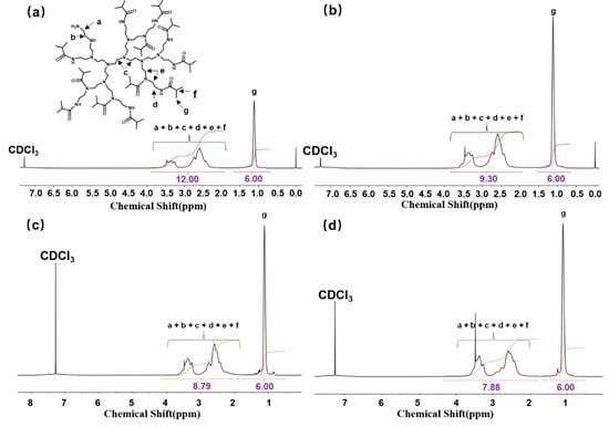 The 1H NMR spectra of HPEI-IBAm with the following degrees of acylation: (a) 50%, (b) 65%, (c) 70%, and (d) 75% in CDCl3.