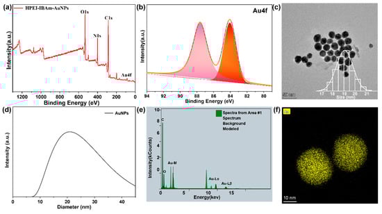 XPS full spectrum of HPEI-IBAm-AuNPs (a) and high-resolution XPS image of Au (b); transmission electron microscopy (c) of HPEI-IBAm-AuNPs and its dynamic light scattering particle size image (d); EDS energy spectra (e), and EDS photographs (f) of AuNPs.
