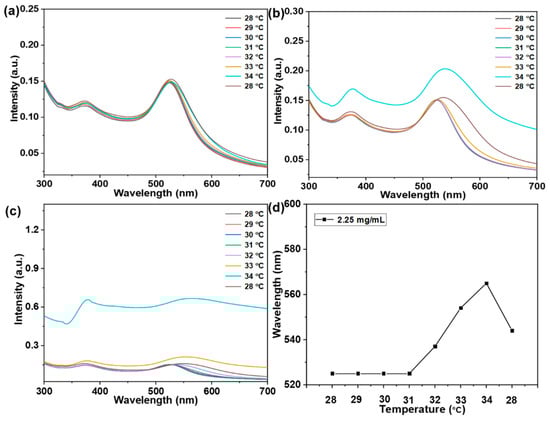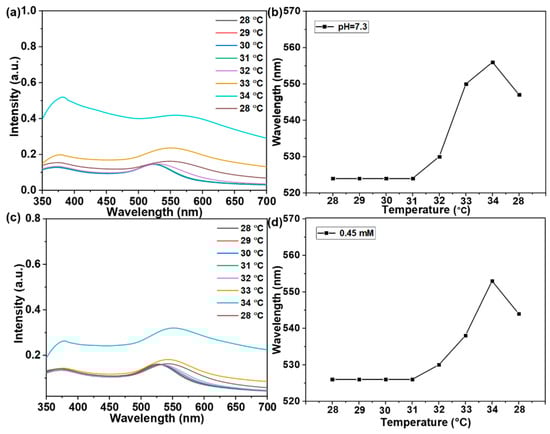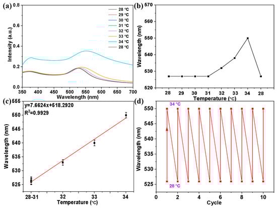Under the optimal experimental conditions, the temperature detection behavior of the probe was investigated. Macroscopic observations revealed that as the temperature was increased close to the cloud point of the solution, the color of the solution changed from its original clear pink to a turbid purple. When the temperature was lowered back to the initial level and after a period of waiting, the solution reverted from the turbid purple color to a clear and transparent pink (Figure S19). This phenomenon demonstrates that the polymer has successfully interacted with the AuNPs, enabling reversible aggregation and de-aggregation processes with temperature changes, accompanied by the expression of different color changes. To record this color change process more accurately, we scanned the absorption spectra of the HPEI-IBAm-AuNP composite system at varying temperatures using a UV–vis spectrophotometer (Figure 6a) and analyzed the change in absorption peaks with temperature (Figure 6b). As shown in Figure 6b, as the temperature increases, the absorption spectrum of the solution undergoes a significant red shift, with the maximum absorption wavelength gradually increasing and shifting towards the long-wave direction, which is consistent with the color change shown in Figure S19. When the absorption wavelength is around 526 nm, the light that is complementary to the red light in the incident light is absorbed by the solution, resulting in a pink coloration. However, when the temperature increases beyond the cloud point, the temperature-sensitive polymers shrink and aggregate, causing the AuNPs to aggregate and increase in size. This results in a red shift in the maximum absorption wavelength of the solution, causing the light complementary to violet light in the incident light to be absorbed by the solution, thereby turning it violet. Through the analysis of the above macroscopic and microscopic phenomena, we can confirm that HPEI-IBAm and AuNPs have successfully formed a complex, and this complex exhibit significant color changes with temperature variations. Notably, the probe displayed a good linear relationship within the temperature range of 32–34 °C, with a correlation fitting coefficient as high as 0.9929 (Figure 6c). As shown in Table S1, comparing the detection range of this probe with other reported temperature-sensitive probes, it is clear that this probe has a significant advantage in terms of detection range [23,25,33,34,35]. Furthermore, we have also investigated the recyclability of the probe. As shown in Figure 6d, after undergoing 10 cycles of temperature fluctuations within the range of 28–34 °C, the probe was able to maintain an accurate temperature detection capability with minimal signal deviation, demonstrating its excellent recyclability. In summary, the probe provides a solid theoretical foundation for applications in visual temperature sensing.
