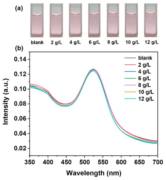 In seven samples, the concentrations of HPEI-IBAm and AuNPs were fixed at 2.25 mg/mL and 0.45 mM, respectively. To each mixed system, 1 mL of NaCl solution with mass concentrations of 0, 2, 4, 6, 8, 10, and 12 g/L was added, respectively, followed by the addition of deionized water to adjust the volume to 2 mL. By observing and recording the changes in the color and UV–vis spectra of the probes, the salt tolerance stability of the probe system was evaluated.