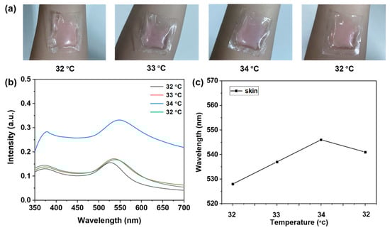 Photographs of probe composite polymer films on skin as a function of temperature (a), the UV–vis absorption spectrum (b), and the variation in maximum absorption wavelength (c) with temperature on skin.