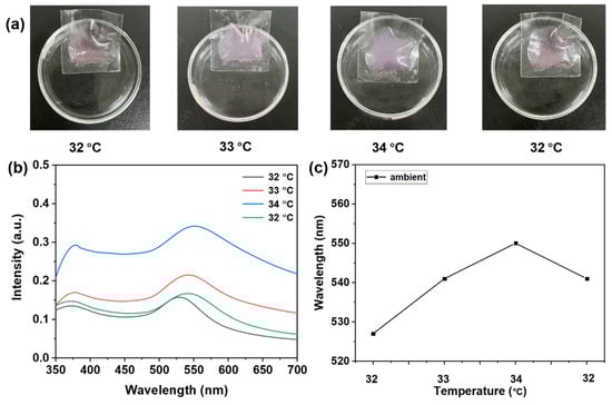 A photograph of the probe composite polymer film in the ambient environment as a function of temperature (a), UV–vis absorption spectrum (b), and the variation in maximum absorption wavelength (c) with temperature in the environment.