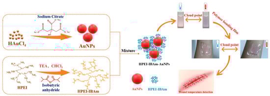 Preparation of HPEI-IBAm-AuNPs and detection mechanism for skin temperature.
