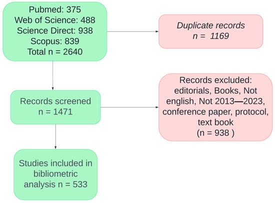 The initial search yielded a total of 2640 records from four databases: PubMed (375), WoS (488), Science Direct (938), and Scopus (839) (see Figure 1). After removing 1169 duplicate records, 1471 records were screened. Of these, 938 records were excluded due to being editorials, books, non-English articles, articles outside the 2013–2023 range, conference papers, protocols, or textbooks. Finally, 533 studies were included in the bibliometric analysis.