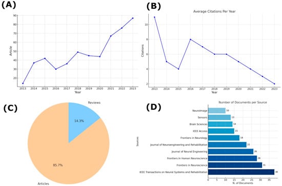 Document Analysis Over the Period from 2013 to 2023. (A) Number of articles published per year. (B) Average citations per year. (C) Distribution of document types between articles and reviews. (D) Number of documents per source, indicating the top 10 publishing journals.