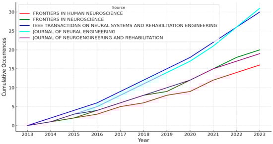 Continuing with the results related to journals, Figure 3 illustrates the cumulative occurrences of publications in the top 5 journal sources from 2013 to 2023. The graph shows a clear upward trend in the number of publications across all sources, with Frontiers in Human Neuroscience and IEEE Transactions on Neural Systems and Rehabilitation Engineering leading in cumulative occurrences. These two journals show a significant increase in the number of publications, particularly after 2016. The remaining sources, Frontiers in Neuroscience, Journal of Neural Engineering, and Journal of NeuroEngineering and Rehabilitation, also demonstrate steady growth, albeit at a slower pace compared to the top journals.