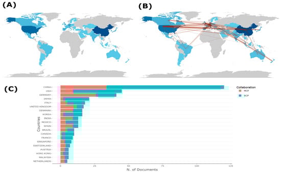 Scientific Output and Collaboration by Country. (A) Global distribution of scientific production, with darker shades representing countries with higher output. (B) International collaboration networks, visualized by the connections between countries through co-authorship and joint research projects, with the brown line specifically indicating the pathways and interactions of these collaborations across different regions. (C) Number of documents by country, differentiated by Single-Country Publications (SCP) and Multiple-Country Publications (MCP), showing the collaboration type for each country.