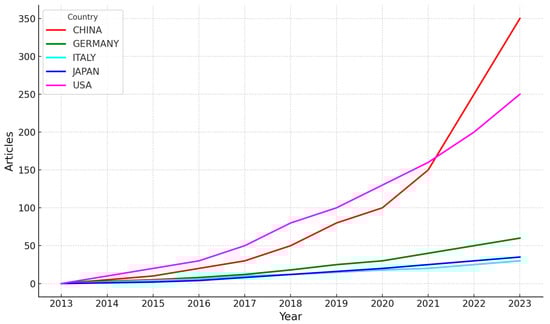 Growth of Scientific Publications by Top Five Countries (2013–2023).