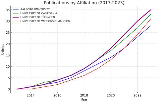 Article Publication Trends by the Top Four Affiliations (2013–2023).