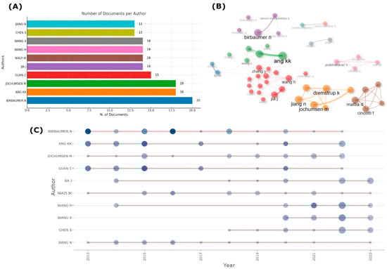 Figure 7 shifts focus to individual author contributions and collaboration networks. Figure 7A identifies leading contributors such as Niels Birbaumer and Kai Keng Ang, who have published the highest number of documents in the field. Figure 7B illustrates the collaboration networks, showcasing clusters of authors working together on EEG-BCI projects. Birbaumer and Ang are central figures in these networks, reflecting the interdisciplinary and international nature of research in this domain. Figure 7C tracks the productivity of key authors over time, showing consistent contributions from figures like Birbaumer, Ang, and Wang X., further cementing their influence in EEG-BCI research.