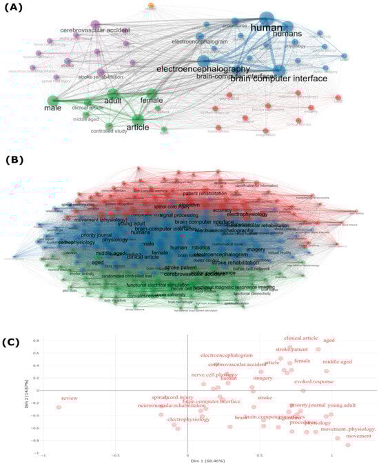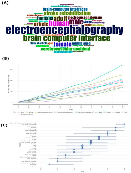 Figure 8B demonstrates the Proportional Distribution of Academic Fields contributing to BCI research. Neuroscience (23.4%) and Medicine (23.3%) are the leading contributors, reflecting the interdisciplinary nature of BCI development. Engineering (18.9%) also plays a significant role, highlighting the importance of technological advancements in BCI applications. The involvement of various fields such as computer science, psychology, and health professions emphasizes the collaborative efforts needed to drive BCI research forward. This interdisciplinary approach ensures that both the technical and clinical aspects of BCI are considered, leading to more robust and practical solutions in rehabilitation [38,39].