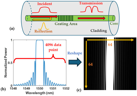 (a) The structure of a regular FBG; (b) a normalized FBG spectrum obtained from simulation, and (c) its reshaped 2D image.