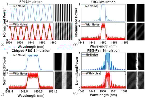 Simulation of high-SNR and noise-added spectra of (a) regular low-finesse FPI; (b) regular FBG; (c) chirped FBG; and (d) FBG pair sensors. The corresponding reshape gray-level image is on the right side of each spectrum.