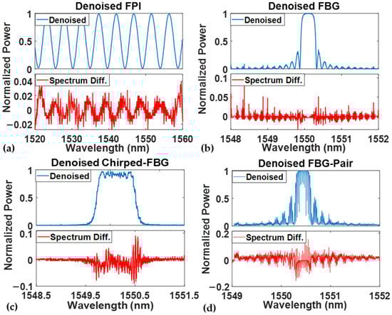Cycle-GAN-based algorithm denoising results of (a) regular low-finesse FPI; (b) regular FBG; (c) chirped FBG; and (d) FBG pair sensors. For each sensor, the top half is the denoised spectrum and the bottom half is the difference from the high-SNR spectrum.