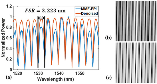 After data collection from the setup shown in Figure 4, both SMF-FPI and MMF-FPI spectra were pre-processed and trained within the Cycle-GAN-based algorithm. Figure 7a displays the original MMF-FPI spectrum collected with MMF and its corresponding denoised spectrum processed by the algorithm. Figure 7b,c illustrate the 2D reshape images of the input and output spectra of the pre-trained denoising model. The FSR calculated for both noisy and denoised spectra is approximately , indicating a close distribution of spectrum peaks and valleys. The results demonstrate excellent FSR maintenance, facilitating further wavelength analysis.