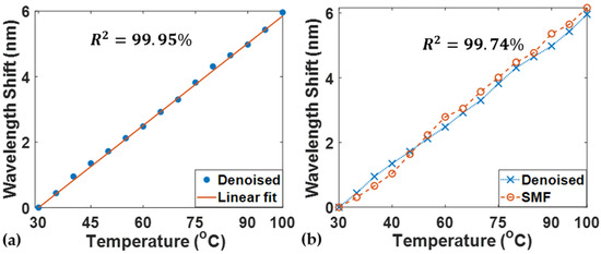 The setup was also employed to perform a temperature-detection test to validate the temperature response of the denoised MMF-FPI. The spectrum was recorded for both the SMF-FPI and MMF-FPI at the same temperature. After applying the denoising algorithm, the wavelength shift was obtained by tracking one of the peaks in the spectrum. The temperature test exhibits a good linearity of the denoised FPI wavelength shift versus temperature variations, as shown in Figure 8a. The of the denoised data and its linear fit is approximately as the temperature changes from to in steps of . The overall selected wavelength peak shift during the temperature change is , indicating a temperature sensitivity of . This is compatible with the theoretical temperature response value of obtained from the literature [29]. The small disparities between the denoised MMF-FPI test and the theoretical value may be attributed to the equipment and operational errors during the experiment. On the other hand, the denoised MMF-FPI exhibits a very similar wavelength shift to the data acquired from the SMF-FPI, as shown in Figure 8b. The temperature sensitivity for the SMF-FPI is , and the between the SMF and the denoised MMF temperature responses is . As a result, the denoised spectrum from the Cycle-GAN-based algorithm achieves the desired temperature response linearity and sensitivity, demonstrating its superior temperature sensing capability compared with the regular SMF-FPI sensor.