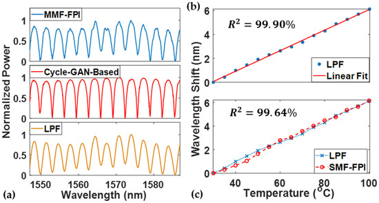 (a) Comparison of spectrum of MMF-FPI and noise-reduced spectra obtained via Cycle-GAN-based algorithm and low-pass filter; (b) wavelength shift versus temperature for MMF-FPI with LPF and its linear fit; (c) wavelength shift versus temperature for SMF and MMF-FPI with LPF.