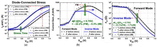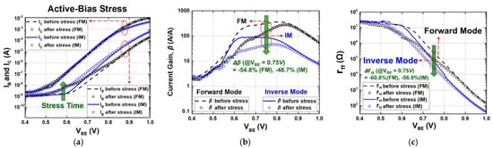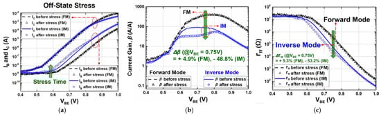 The overall transistor characteristics under each stress condition (active bias, diode connection, and off state) are shown in Figure 2, Figure 3 and Figure 4, respectively. The degradations in the electrical collector current (IC) and the base current (IB) of a SiGe HBT were measured for both FM and IM before and after 3000 s of stress time. As shown in Figure 2a, Figure 3a and Figure 4a, the changes in IC were much less than those of IB in general. Because of an increase in IB, current gain (β) reduces over stress and the degradations are severe when VBE is below approximately 0.8 V, whereas moderate or negligible deviations were observed with high VBE [3,26,27].