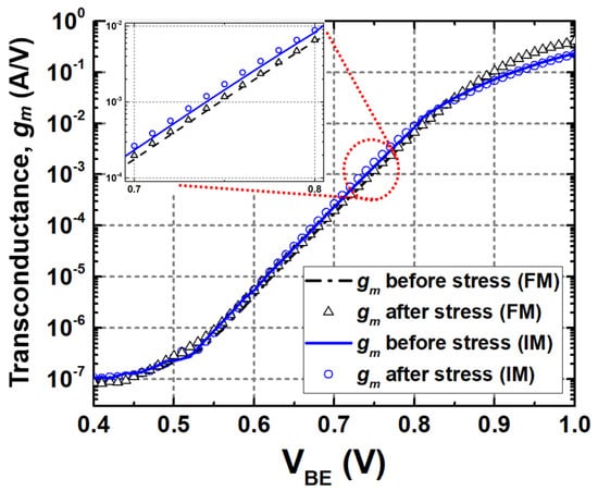In the off-state stress configuration, the base terminal was grounded, while the stress voltage is applied only to the electrical collector (Figure 1c,f). Stress time was the same as in the previous cases and the applied stress voltages were set to turn off the device; VBE and VCE were 0 V and 3.6 V, respectively. In contrast to the other stress conditions, it shows a little degradation in IB in FM, but a significant increase in IM (Figure 4a). An increase of −4.9% and 113.2% was observed in FM and IM with a VBE of 0.75 V, respectively. The small degradation in FM implies that the EB spacer is not introduced to additional traps. On the other hand, in IM, a high electric field applied across the EB junction leads to damages, and consequently, a leakage current due to breakdown effects. Figure 4b shows β versus VBE before and after stress. It reads a 4.9% increase in FM and a 51.2% decrease in IM, which can be implied from the Gummel response. As shown in Figure 4c, rπ increases by 5.3% in FM, but decreases by 53.2% in IM after 3000 s of voltage stress. Since there were little changes in IB under FM, the resulting decrease in rπ and β was negligibly small. It showed that a variation in current gain was 4.9% under the bias of VBE = 750 mV after 3000 s of stress, which is within the boundary of 10% reduction in terms of device lifetime. In contrast to the previous active-bias and diode-connection conditions, the off state showed a worse degradation in IM. This shows that the off state is significantly affected by electrical stress in IM.