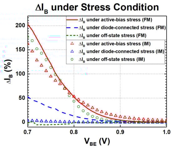 The non-ideal base current increases with the stress voltage. Consequently, the current gain is reduced by the leakage current at the base, which eventually degrades the circuit/system performance [36,37,38]. Whereas the key mechanism of degradation is related to hot carriers in a SiGe HBT, however, the electrical configuration of a device in a circuit leads to different performance changes. In a variety of analog applications, a SiGe HBT is under and among an active bias, diode connection, and off state, which will not present the same degradation characteristics between FM and IM. Therefore, for circuits with IM SiGe HBTs, it is pivotal to understand device characteristics under each stress condition for predicting long-term reliability issues in the design phase and dealing with potential performance loss.