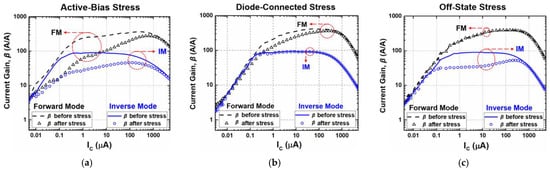 Degradations in current gain (β) versus IC under (a) active-bias, (b) diode-connected, and (c) off-state stress conditions.
