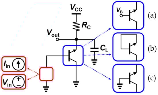 Basic schematic of TIA or voltage amplifier under (a) active-bias; (b) diode-connection; and (c) off-state conditions. Red boxes show types of signal sources and blue boxes show possible types of stress.