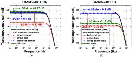 In contrast, the other two stress cases did not show significant changes in TIA gain and bandwidth. Regarding the diode-connection stress case, one thing to note is that when the VCC is raised to 3.6 V, the effective bias applied at the base and collector node is about 0.8 V, which indicates that the device is still in the safe operation area (SOA). From the device test, it was verified that there was no noticeable degradation under this bias condition. Therefore, in the amplifier configuration, the performance variations are negligible. Lastly, in the off-state stress, the degradations in rπ and gm result in a gain increase of 0.4 dB, which is attributed to a small increase in rπ (see Figure 9a). In Figure 9b, before- and after-stress results in the IM TIA are shown. Similarly to the FM TIA case, it exhibits large degradation in the active-bias stress conditions and negligible changes in the diode connection in terms of gain and bandwidth. For the off-state stress, however, performance degradations were severe and close to those of the active-bias case, meaning that the IM operation may present long-term reliability risk, as implied from Table 2.