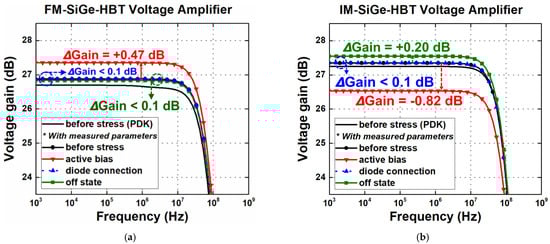 In Figure 10, the Bode plots of the FM and IM SiGe-HBT voltage amplifiers are shown. In this amplifier configuration, the gain of the circuit is now directly dependent on gm and is not affected by the variations in rπ, presenting similar trends to the characteristics of gm under the three stress conditions extracted in Section 3. The FM voltage amplifier showed an increase of 0.47 dB and 0.04 dB in the active-bias and off-state conditions, respectively. In the IM case, it showed a decrease of 0.82 dB and an increase of 0.2 dB in the active-bias and off-state conditions, respectively. Lastly, both the FM and IM voltage amplifiers exhibited no degradation in the diode-connection stress. It is interesting to observe that the voltage amplifier shows a relatively minor change in performance for the given stress time, compared with the TIA. This implies that the SiGe HBTs will present more robust operation if they are driven by input voltages rather than input currents.