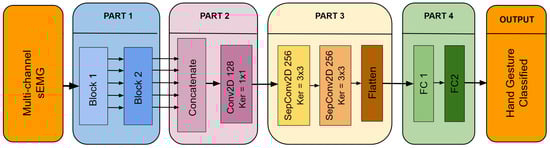 - As seen in Figure 2, this part is divided into two distinct blocks. Block 1 aims to extract features to capture the spatio-temporal patterns in the sEMG signal. The multichannel sEMG signal is represented as an image for each sample.A set of five filters, sized (W × 3, 2*W × 3, 3*W × 3, 4*W × 3, and 5*W × 3) are employed in Block 1, where W is selected as 1/20 of the chosen window size. The selection of these sizes was driven by the need to parameterize the model consistently across different window sizes to facilitate parameter tuning and comparison. Larger filter sizes correspond to lower-frequency related characteristics and vice versa.Each feature map output from the parallel convolutions of Block 1 is then fed into Block 2. Block 2 has a similar structure and uses five additional convolution layers with fixed 3 × 3 filter sizes. In Block 2, separable convolutions are used to reduce the number of trainable parameters, and the number of neurons in each layer is always doubled compared to the previous ones. Furthermore, the dropout layers and Batch Normalization (BN) layers in both blocks are implemented to increase the MSCNN model’s overall generalizability.