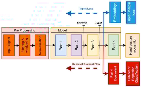To achieve these goals, different pre-processing steps, including rectification, window length, and normalization procedures, were analyzed. The study also investigated Transfer Learning with few-shot learning for new user fine-tuning. In the end, to evaluate generalization, we employed an adversarial network with gradient-reversal descent [30] and self-supervision with triplet margin loss [31].