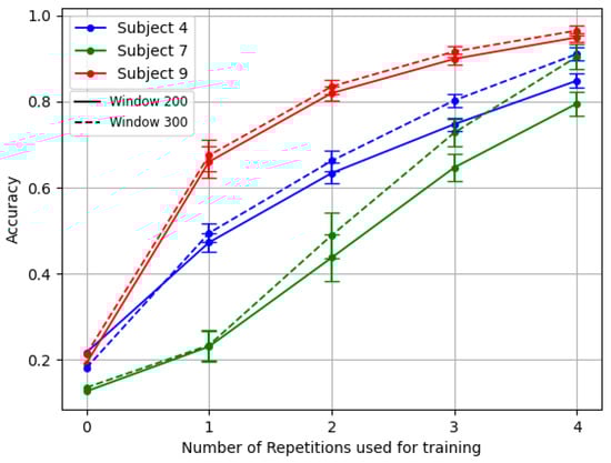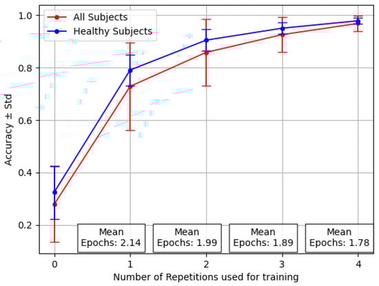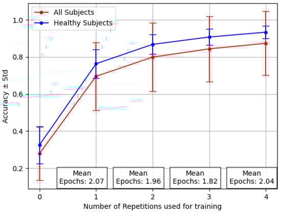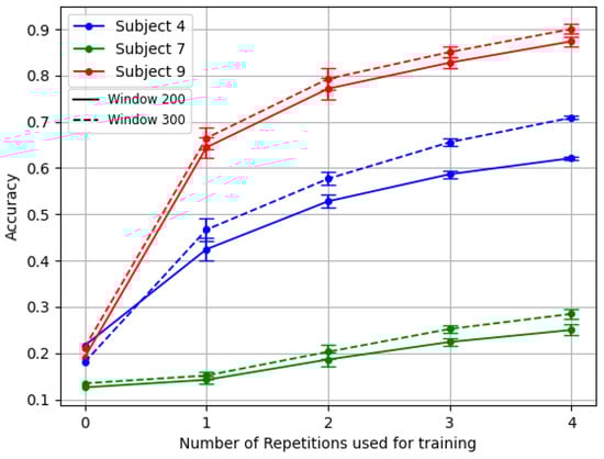 Experiments were conducted with varying data quantities to be used in retraining (from 1 to 4 repetitions) for each subject. For each amount of data, the model was re-trained five times by varying the combination of repetitions. This allowed us to observe the model’s behavior and its vulnerability to overfitting during the fine-tuning process.