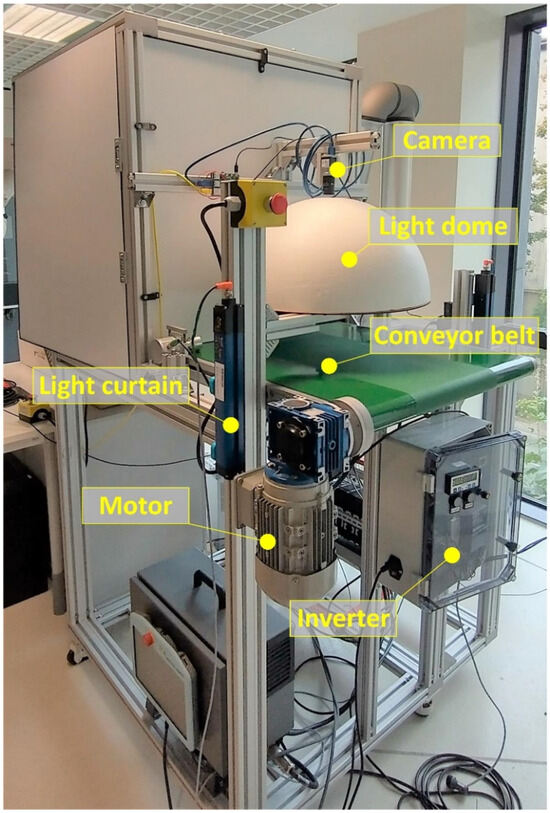 The laboratory stand presented in Figure 2 consists of a conveyor belt driven by an electric motor controlled by an inverter. The belt speed is about 20 cm/s. Above the belt is a frame with the high-performance 5-megapixel monochrome CMOS camera (CA-H500MX, Keyence, Osaka, Japan) with a low distortion 12 mm lens (CA-LHR12) and a spherical dome light with an LED illumination ring.