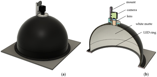 A significant problem in the practical application of the inclusion detection method is shadows and reflections in the camera image. For this reason, appropriate diffuse illumination is essential in industrial optical inspection tasks involving shiny or complex surface details that require uniform visibility. Both modules of the prototype are equipped with dome lights, which produce non-directional reflected light (Figure 4) and effectively reduce glare and shadows. The domes were designed and produced to meet the requirements of the project. To achieve uniform illumination, each dome is a combination of a hemisphere and a cylinder. It is made of laminate, coated inside with a white matte finish, and equipped with an LED light source facing up that illuminates objects with reflected light. The exterior is coated with a black finish. The dome is equipped with a precision mount for a camera directly above the oculus.