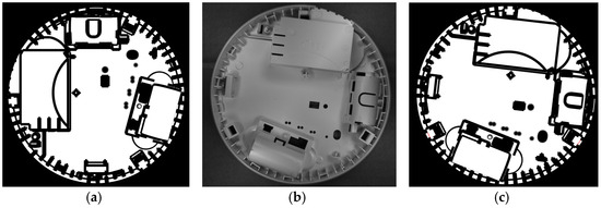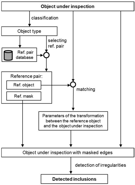 The diagram of the proposed method is presented in Figure 5. At the off-line stage, the reference pair database should be prepared. It contains two images for each element: the image of the element and the mask of edges. The algorithm for the preparation of the reference pair database is presented in Section 2.3. At the on-line stage, the object under inspection is classified—see Section 2.4 for the details—and matched with the corresponding reference image. The purpose of matching is to find parameters of transformation, composed of translation, rotation, and scaling, between the inspected object and the reference mask. Since the matching algorithm should receive two grayscale images as the input, the image of the object under inspection cannot be directly matched with the binary reference mask. Instead, it is matched with the reference image, which has the same parameters of translation, rotation, and scaling as the reference mask. After finding the parameters of transformation, the reference mask is transformed and superimposed with the image under inspection. For the part of the object surface that is not masked, local standard deviation is calculated. Areas where it exceeds the threshold value are considered inclusions.