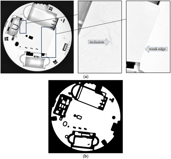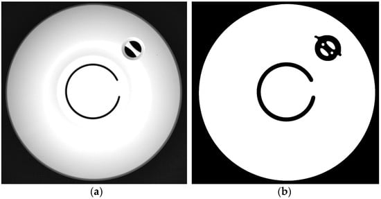 The complexity of the problem presented in the paper is related to the intricate geometry of the examined elements. As shown in Figure 1, the magnitude and size of the inclusion are very small compared to the changes in the image grayscale at the edges. Algorithms that could detect inclusions as local changes in the image intensity would mostly return false detections at intensity changes resulting from the geometry of the object. This is why, in the first step, the edges of the object should be localized in the image and excluded from calculations. A straightforward approach would use edge detection algorithms, such as the Canny edge detector [21] or the two-dimensional Gabor filter [22]. However, such filtering-based methods could not discriminate between weak edges and some flaws of the element, which would generate local, closed edges. Any flaws incorrectly classified as edges, and therefore excluded from further calculations, could not be detected.