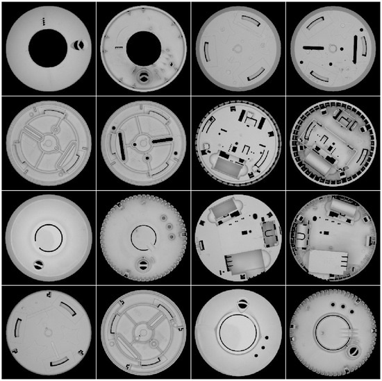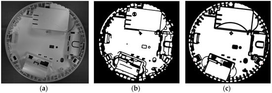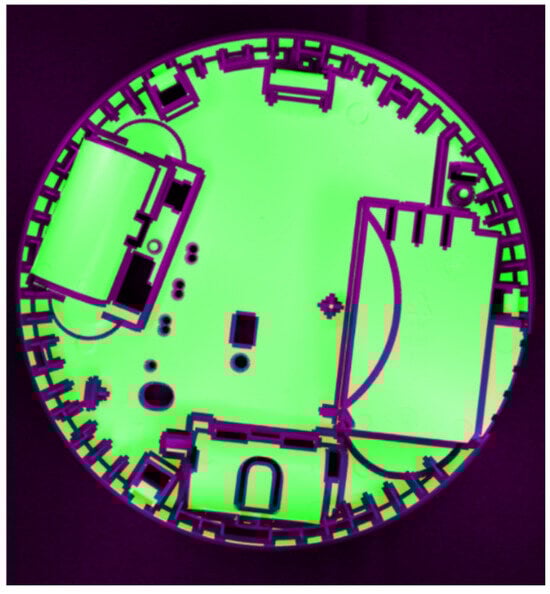 The first test of the algorithm was conducted on 15 types of double-sided parts moving on the conveyor, with edge masks calculated from 3D models. However, it was noticed that effectiveness strongly depends on proper mask preparation. Since the edges were derived from CAD models, initially the edge masks did not contain artifacts such as injection marks resulting from the technological process of molding. There is an example of such artifacts in the first row of Figure 15—three big irregularities identified as inclusions come from injection marks. However, these irregularities should be treated as normal, so the masks need to be manually corrected to extend the masked area to the injection marks.
