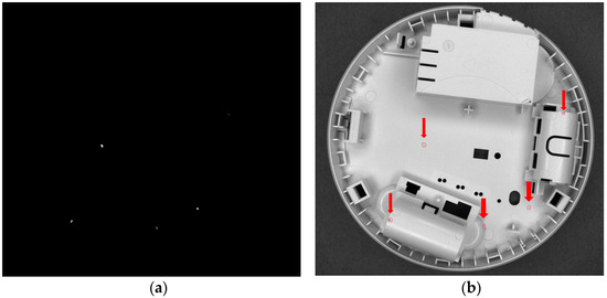 Final result—areas where, in all photos with side lighting, the local standard deviation exceeds the threshold value (a), and these areas (indicated by red circles and arrows) superimposed on the original photo (b).