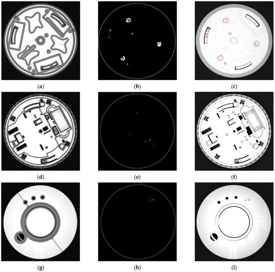 Sample results of inclusion detection for three different parts. Each row corresponds to the same part. Left column (a,d,g) shows images of parts with their masks superimposed. The middle column (b,e,h) shows detected inclusions. Right column (c,f,i) shows the parts with inclusions drawn in red.